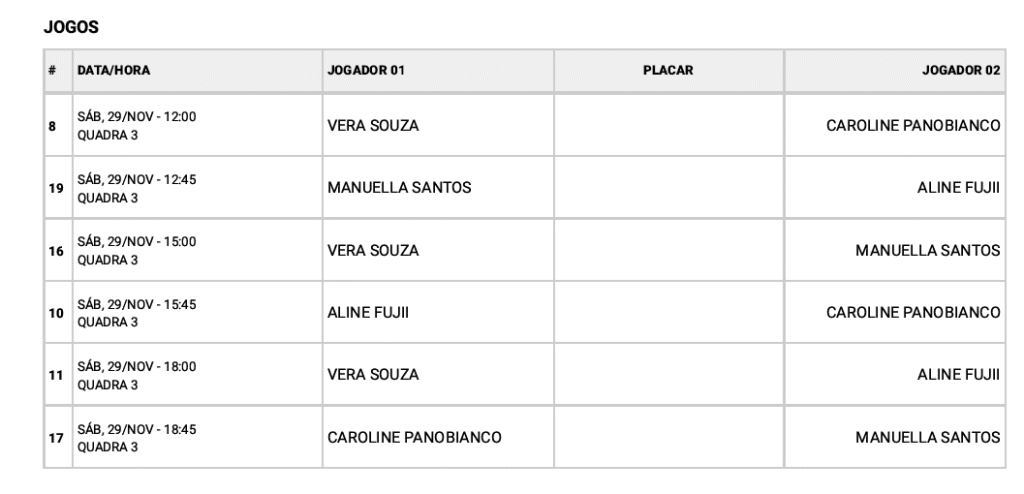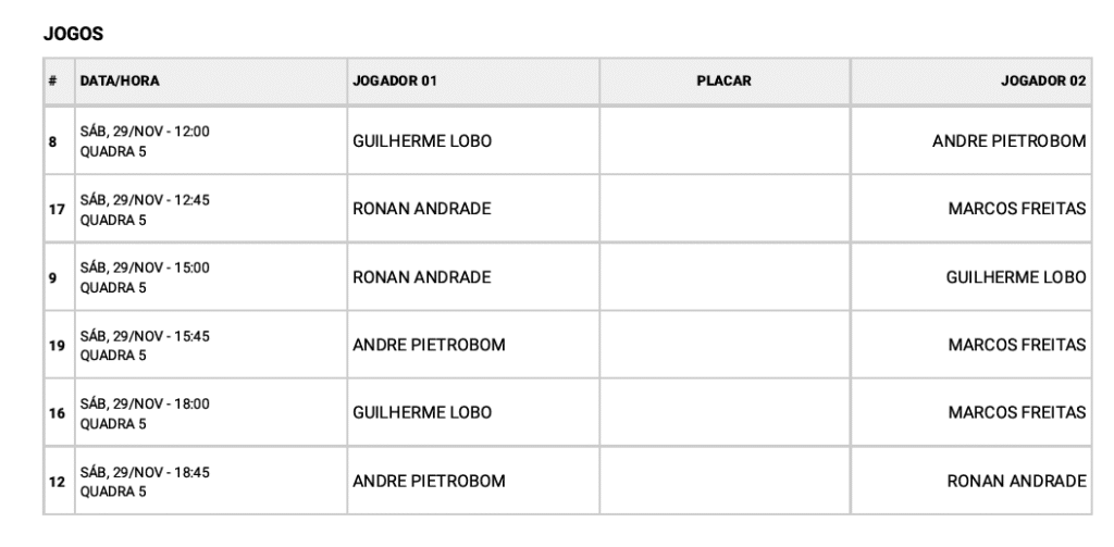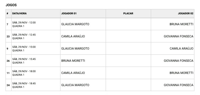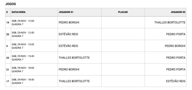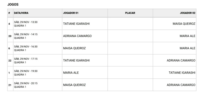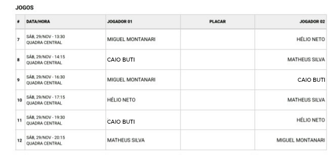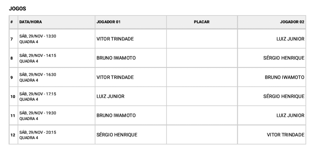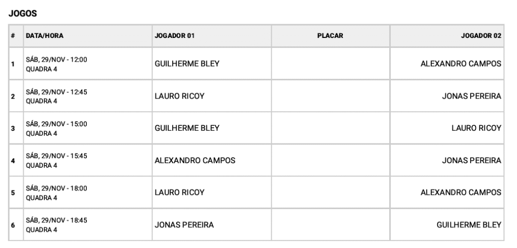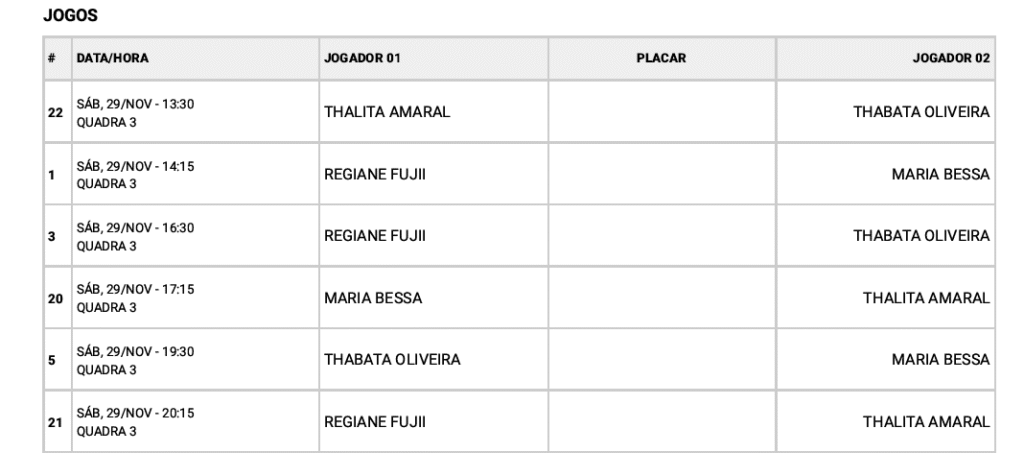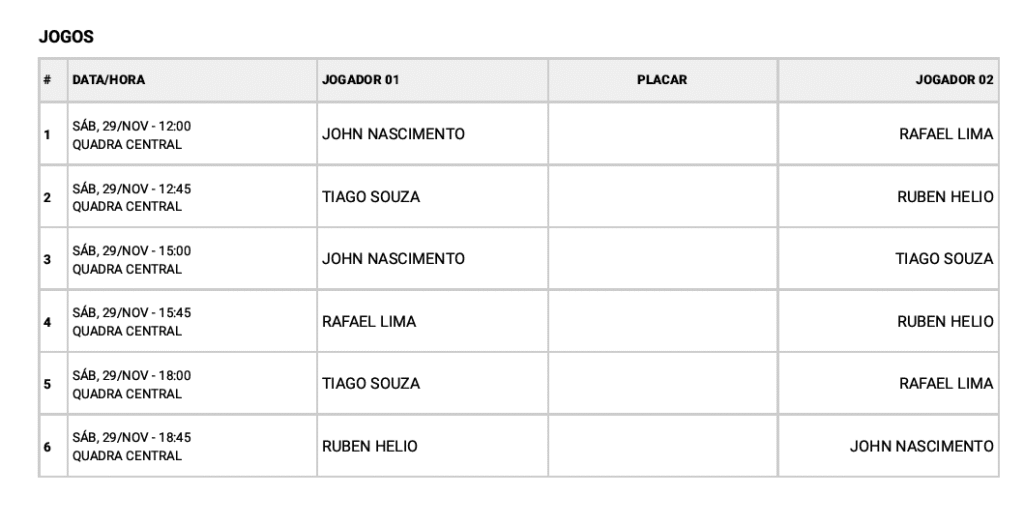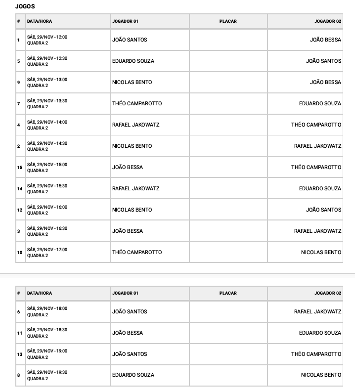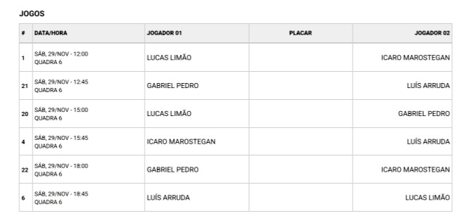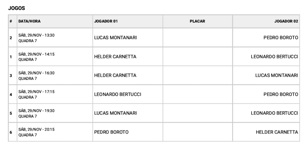 Os sorteios já foram realizados e já temos os horários das partidas. Cada jogador (Exceto sub-14) fará três partidas que serão disputadas em sets únicos. Em caso de empate em 6×6, disputa de tie break que acaba em sete pontos ou tem que abrir dois em caso de 6×6. Os sets permanecem sendo disputados no sistema NO-AD, onde o recebedor escolhe o lado para receber o saque em caso de empate no game em 40-40. Os dois melhores classificados segundo os critérios da Letz Play farão as semifinais no domingo, 30/11.