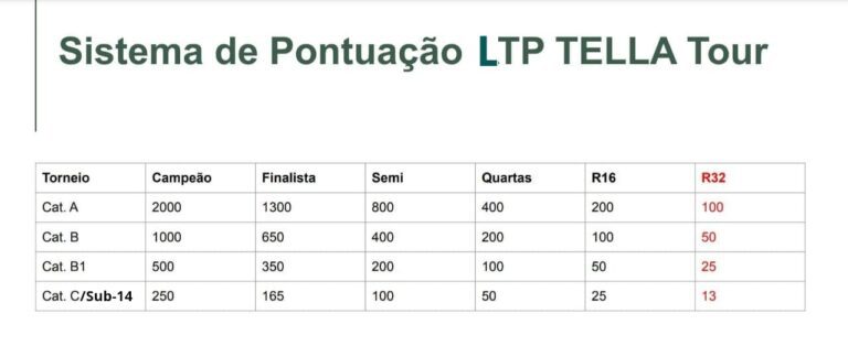 O sistema de pontuação que a LTP TELLA TOUR adotou para os torneios é o mesmo adotado pela WTA e ATP, inclusive para defesa de pontos em cada torneio em 2026. Desta forma, a cada participação, o atleta recebe a pontuação relativa à fase foi eliminado ou garante a pontuação máxima da categoria, caso seja campeão.