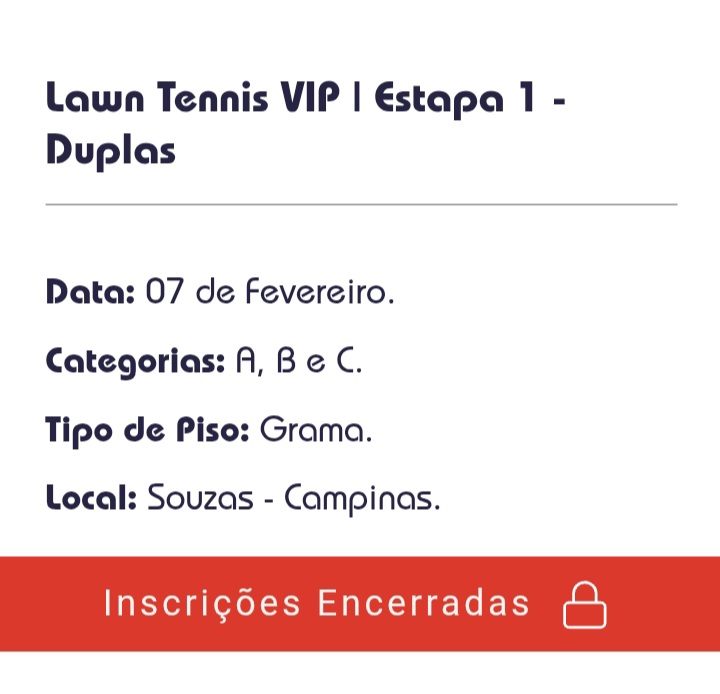 🎾 Categorias: A, B e C | Piso: grama